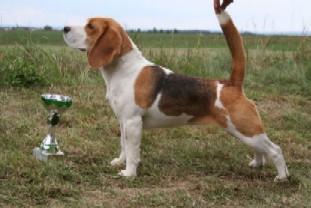 Naši Megie ( původně Vrtuli) jsme si koupili u chovatelů Šabatových, abychom mohli někdy v budoucnu krýt taky vlastními pejsky ze smečky (především s Cannym). Je to velice milá, poměrně malá fena s kompaktním tělem a dobrým zauhlením. Má hezkou hlavu s tmavým nosem a plnými pysky. Nás si úplně získala svýma krásnýma očima. Během své výstavní kariéry posbírala několik zajímavých titulů, dokonce nezklamala ani na vyhlášené klubové výstavě v Dánsku. 2 nejkrásnějš íštěňátka z vrhu Meginky s Keníkem jsou členy chovatelské stanice Van'Ros'Beagles v JAR.